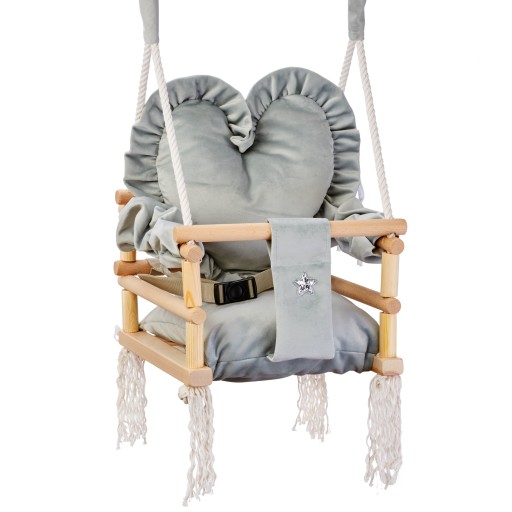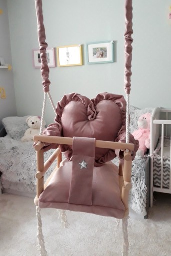 Huśtawka wykonana z delikatnego aksamitno pluszowego materiału, który jest bardzo miękki i delikatny w dotyku oraz bardzo wytrzymały.