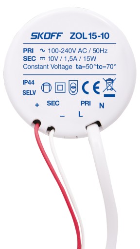 ZOL15 to zasilacz impulsowy o napięciu wyjściowym 10 V DC i mocy znamionowej 15 W. Przeznaczony jest do zasilania napięciem stałym opraw oświetleniowych LED, w szczególności do współpracy produktami marki SKOFF (oprawy oświetleniowe LED), które wymagają napięcia 10 V DC. Produkt posiada zabezpieczenie przeciwzwarciowe i przeciążeniowe. Przeznaczony jest do bezpośredniego montażu w puszce instalacyjnejØ 60 mm.