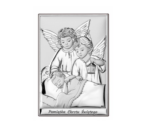 Pamiątka włoskiej firmy przedstawiająca wizerunek Aniołków nad śpiącym dzieciątkiem . Całość została zamknięta w kształcie klasycznego prostokąta z podpisem Pamiątka Chrztu Świętego. Dzięki wkładanej podpórce obrazek możemy umiejscowić na komodzie lub powiesić na ścianie.