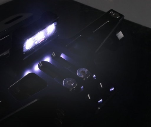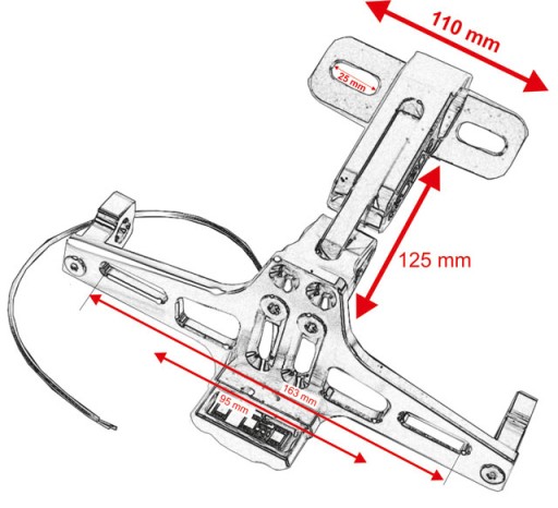 Uchwyt/mocowanie tablicy rejestracyjnej w motocyklu oraz innych pojazdach. Tablica jest podświetlana.