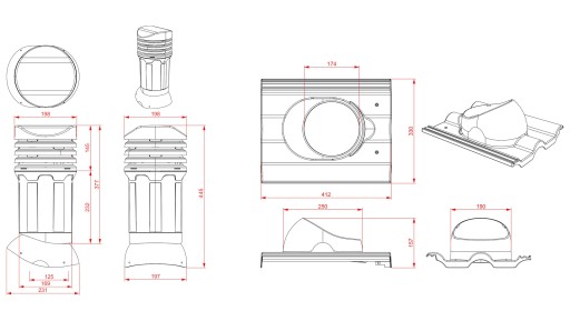 Kompletny kominek wentylacyjny z profilowanym przejściem dachowym, montowany bezpośrednio na dachówce. Specjalne kanały odprowadzają skropliny (kondensat) na pokrycie dachowe.