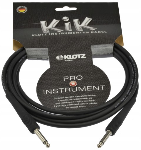 Seria gitarowych i instrumentalnych kabli Klotz KIK oferuje niezwykle zbalansowany dźwięk. Wyprodukowany z najwyższej jakości miękkiego PVC przewód jest bardzo elastyczny i zapewnia trwałość elektryczną na całe długie życie kable. Dodatkowo rdzeń kabla ma niską pojemność wynoszącą 115pF/m. Firma Klotz wybrała złącza jack o niskiej pojemności, zabezpieczone dodatkowo kołnierzem chroniącym przed uszkodzeniami.