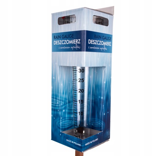 Wyprodukowany w Polsce deszczomierz Rain Gauge ze wskaźnikiem sumatora i kijem to propozycja dla osób ceniących sobie prostotę i funkcjonalność. Składa się on z przezroczystego lejka mierniczego, wykonanego z wysokiej jakości tworzywa sztucznego oraz szpiczastego palika z impregnowanego drewna. Na obwodzie umieszczone są dwa wskaźniki w różnych kolorach, które pozwalają na rejestrację dziennych, miesięcznych lub nawet rocznych opadów. Skala ze zwiększona dokładnością pomiaru do 0,5mm umożliwia jednorazowy pomiar opadu do 35mm. Specjalna konstrukcja pierścienia mocującego gwarantuje optymalne ustawienie deszczomierza względem padającego deszczu. Układ sumatora pozwala rejestrować łączny opad do 250 mm (250l/m2).