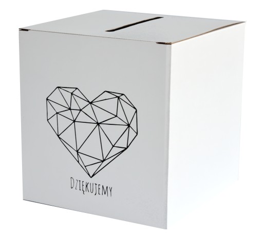 Pudełko "samoskładające" z napisem "Dziękujemy" i geometrycznym sercem.