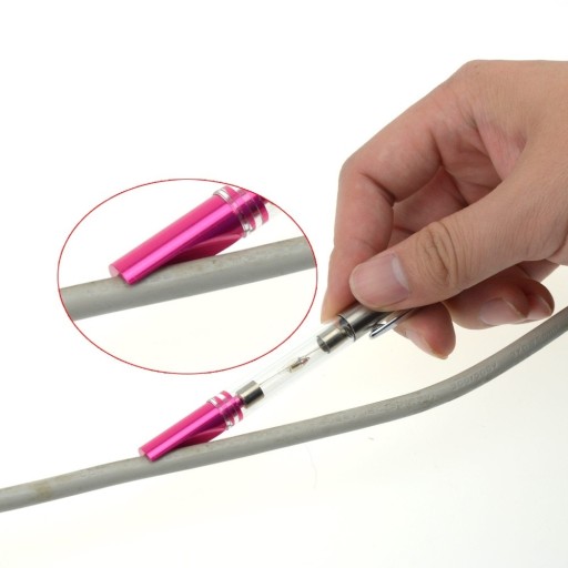 - Aby użyć testera przykładamy różową ściętą końcówkę na przewód obejmując go jak na zdjęciach.