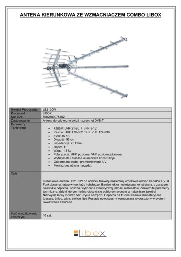 LIBOX LB2100W to profesjonalna antena kierunkowa przeznaczona do odbioru sygnału cyfrowego DVB-T zarówno w paśmie UHF (MUX 1,2,3) jak i VHF (MUX 8). Profesjonalne wykonanie anteny gwarantuje odbiór programów w najwyższej jakości. Dzięki swojej konstrukcji antena charakteryzuje się szczególnie dużym zyskiem. Części anteny wykonane z aluminium, stalowe elementy konstrukcyjne ocynkowane galwanicznie.