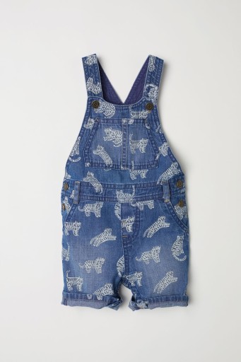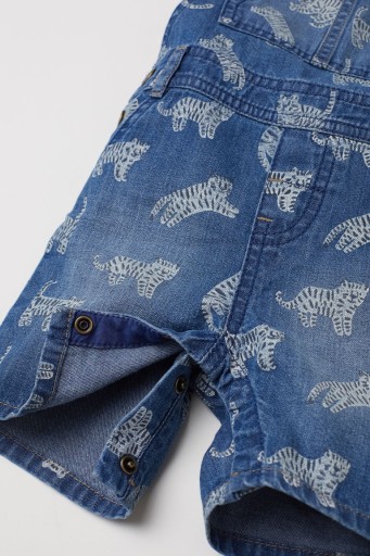 - Szorty ogrodniczki z miękkiego spranego denimu we wzorzyste nadruki. Szelki z regulowanym zapięciem. Atrapy kieszeni po bokach i z tyłu, atrapa rozporka. W talii odcięcie z zatrzaskami, kryte zatrzaski w kroku i wzdłuż nogawek.