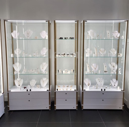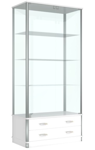 Szklana gablota 80x40x190 z oświetleniem LED i 2 szufladami w całości zamykana, wykonana na bazie profili aluminiowych anodowanych.