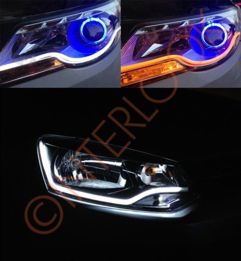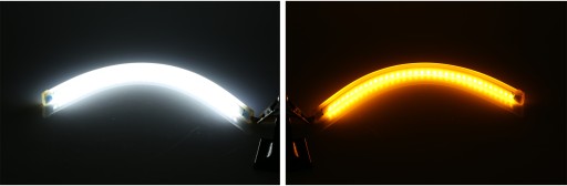 - Taśmy świecą barwą białą (6000k) podczas normalnej jazdy. Po włączeniu kierunkowskazów światła "pływają" w kolorze pomarańczowym