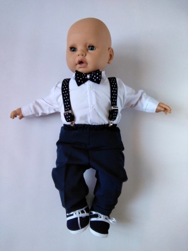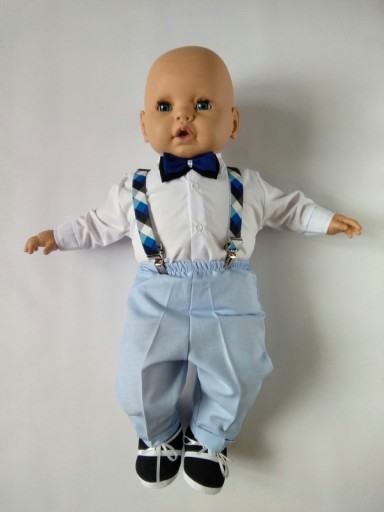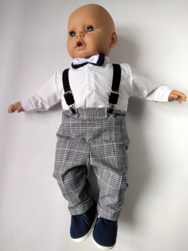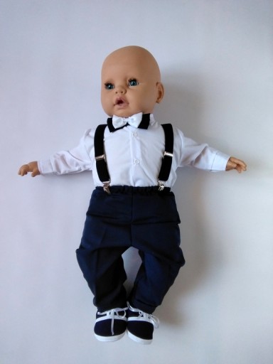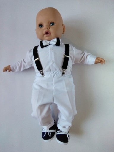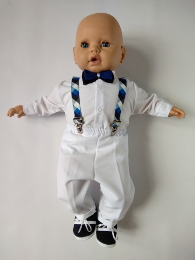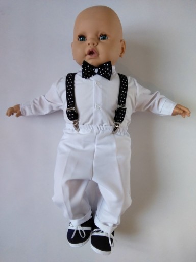 Koszulobody z długim rękawem, w białym kolorze. Zapinane na wygodne napki. Muszka wiązana na tasiemce dodaje szyku i elegancji. Spodnie z delikatnego materiału, mają krój na kant, na dole nogawki elegancki mankiet. W pasie na gumeczce. Jednak uwagę przyciąga wykończenie kompletu - czyli efektowne szelki w różnych kolorach do wyboru