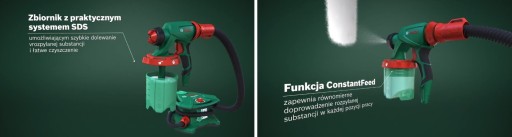- Pojemnik na farbę z funkcją ConstantFeed zapewniającą równomierne doprowadzenie farby, także podczas prac nad głową lub tuż przy podłodze