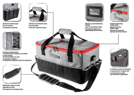 - Torba posiada 14 kieszeni zewnętrznych, 7 pojemnych kieszeni wewnętrznych oraz 10 zaczepów na narzędzia,