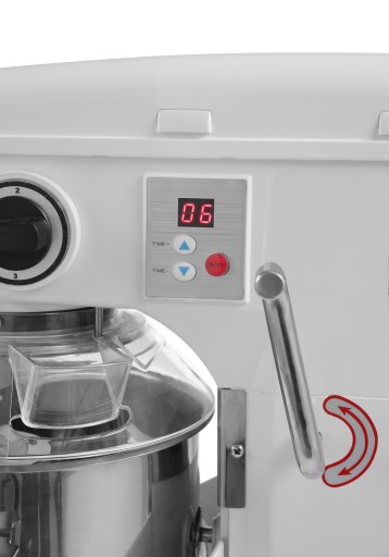 Intuicyjny panel sterowania umożliwia wybór jednej z trzech dostępnych prędkości, co pozwala na łatwe dostosowanie obrotów mieszadła do rodzaju przygotowywanego ciasta. Za pomocą timera można ustalić czas pracy urządzenia w zakresie od 1 do 60 min.