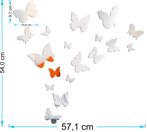 Motylki na ścianę wykonane są ze szkła akrylowego PMMA. Lustrzany materiał świetnie komponuje się na każdej ścianie. Idealne rozwiązanie na wypełnienie pustej przestrzeni do salonu, pokoju dziennego lub dziecięcego