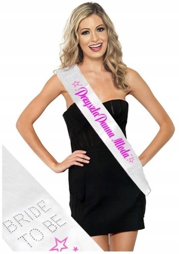 - Szarfa "Przyszła Panna Młoda" w kolorze białym z różowym napisem o długości ok. 160 cm i szerokości ok. 10 cm