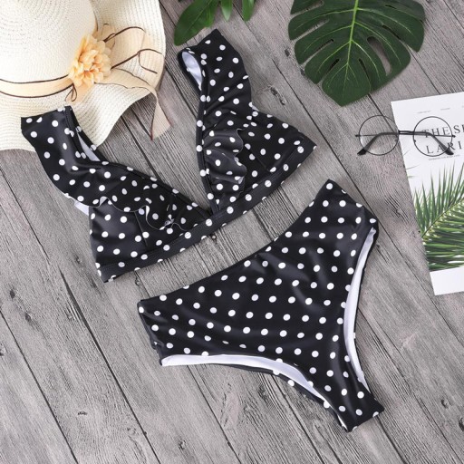 SEKSOWNE BIKINI W KROPKI Z OZDOBNĄ FALBANKĄ NA DEKOLCIE