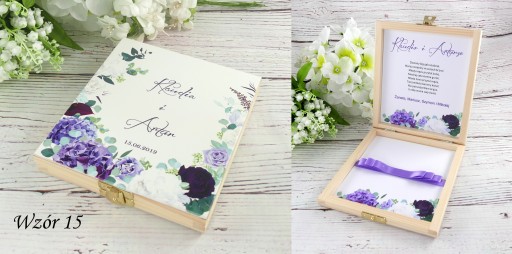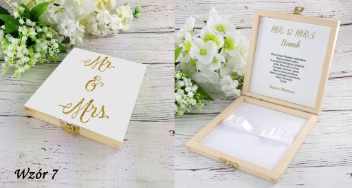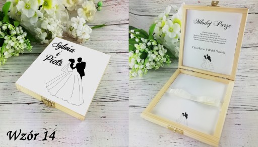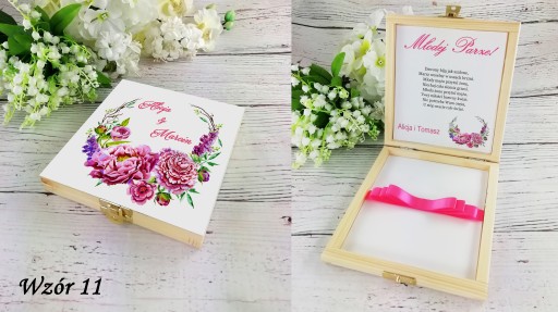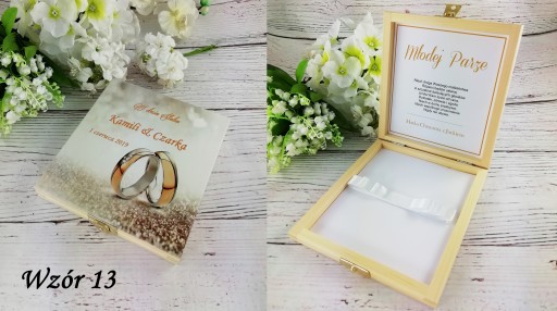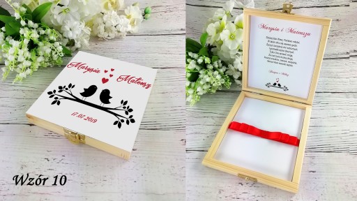 - Drewniane, zdobione pudełko na pieniądze idealne na ślubny prezent - pamiątkę.
