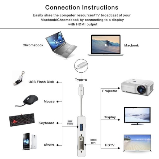 Adapter pozwalający podłączyć przez port USB-C laptopa, macbooka, chromebooka, smartfona lub inne urządzenia z gniazdem USB-C do telewizora, monitora lub projektora wyposażonych w jeden z portów: HDMI, VGA lub DVI. Dodatkowy port USB 3.0 obsługuje transmisję danych o szybkości 5 Gb/s, obsługuje urządzenia peryferyjne USB takie jak myszkę, klawiaturę, pamięć flash, dysk.