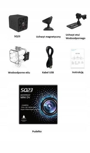 SQ23 to udoskonalony następca SQ13. Dodano między innymi magnes w samej obudowie kamery, dzięki czemu można ją zamontować do dowolnej powierzchni metalowej, bez żadnych dodatkowych mocowań. Została wyposażona również w Czujnik Ruchu, który aktywuje kamerę, gdy wychwyci ruch w obrębie pola kamery. Mini kamera ma niewielkie rozmiary, dzięki czemu nie zajmuje dużo miejsca i można ją zabrać wszędzie ze sobą. Dzięki wodoszczelnej obudowie, możesz zrobić wspaniałe ujęcia podwodne! Obudowa gwarantuje wodoszczelność do 30 metrów. Można zabrać ją na rower, narty, łódkę,motocykl, czy podczepić ją do drona. W zestawie znajduje się magnetyczny uchwyt, który pozwala zamocować kamerę do praktycznie każdej powierzchni.