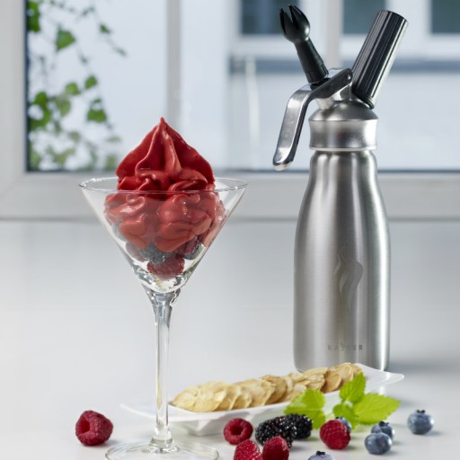 Profesjonalny syfon do bitej śmietany marki Kayser to łatwy i wygodny w obsłudze sprzęt, który pozwoli przygotować nie tylko bitą śmietanę ale również rożnego rodzaju musy i pianki w tym także na ciepło. Sprawdzi się idealnie zarówno w restauracjach, kawiarniach, lodziarniach, jak i w warunkach domowych. Syfon posiada certyfikat CE i spełnia wymagania Sanepidu