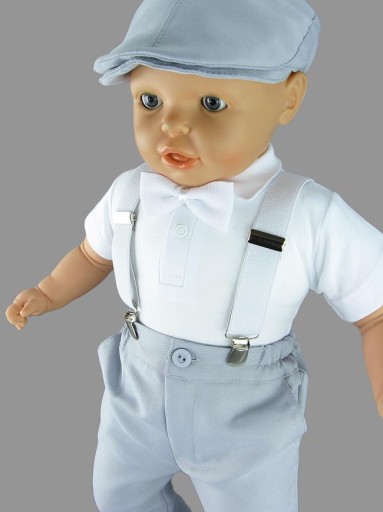 - czapka typu kaszkiet, wykonana z tkaniny garniturowej jak spodenki, wyłożona podszewką z bawełny, z tyłu wszyta guma dla regulacji obwodu