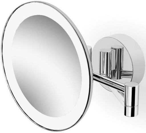 Funkcjonalne lusterko kosmetyczne powiększające, wyposażone w podświetlenie LED, osadzone na podwójnym ruchomym ramieniu.
