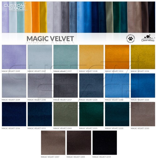 Elegancka i "aksamitna" w dotyku tkanina welwetowa. Wykonana w technologii CLEANABOO umożliwiającej łatwe usuwanie zabrudzeń. Każdy rozlany na materiale płyn formuje się w krople i nie wnika w głąb tkaniny.