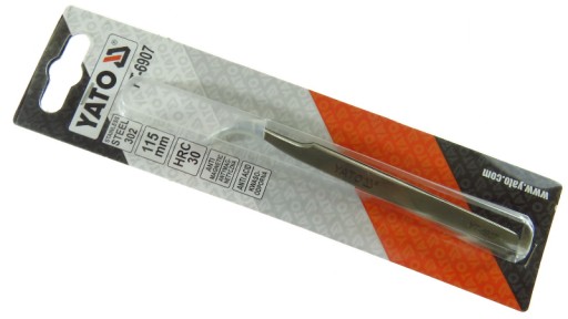 Pęseta odgięta o długości 115mm marki YATO YT-6907 wykonana ze stali nierdzewnej. Twardość w skali Rockwella 30 HRC. Antymagnetyczne, odporne na działanie kwasów.