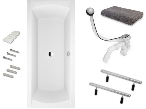 W skład zestawu wchodzi: wanna, wysokiej jakości syfon automatyczny, stelaż + nogi, uchwyty mocujące do ściany, ręcznik łazienkowy