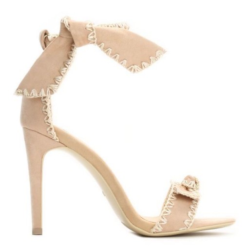 Szpilki w kolorze beżowym, zamszowe - na górze wiązane.