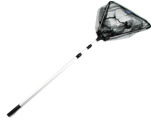 Podbierak z teleskopowym ramieniem, 3 sekcyjnym, kosz w kształcie trójkąta.