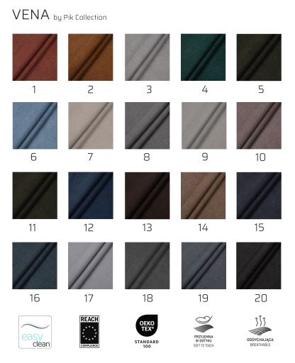 Tkanina obiciowa Vena to niezwykle miły w dotyku materiał, który zachwyca swoją funkcjonalnością i estetyką. Tkanina wyprodukowana w technologii Easy Clean, dzięki czemu utrzymanie jej w czystości nie będzie stanowić problemu. Obok walorów użytkowych materiał wyróżnia się również wysoką trwałością.