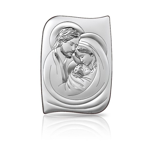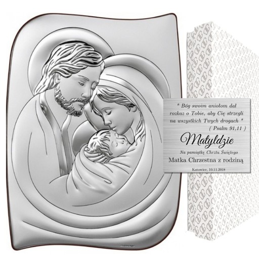Pamiątka włoskiej firmy BELTRAMI wizerunkiem Świętej Rodziny. Obrazek Świętej Rodziny zostało zaprojektowany i wykonany z najwyższą starannością. Obrazek pokryty jest wartą czystego srebra 999,95; Dzięki osobistej dedykacji wykonanej na srebrnej blaszce prezent stanie się pamiątką na długie lata. Idealny prezent, pamiątka na okazję Chrztu Świętego lub Ślubu.
