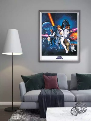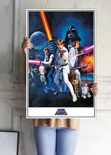 Plakat "Star Wars Gwiezdne Wojny - Film Poster" to ikoniczne dzieło, które przedstawia głównych bohaterów sagi: Luke'a Skywalkera, Lei Organa i Dartha Vadera. Kompozycja plakatu jest dynamiczna i pełna akcji, oddając napięcie i epickość filmu. Kolorystyka plakatu opiera się na kontrastujących odcieniach niebieskiego, czerwonego i czarnego, co dodaje mu intensywności. Logo "Star Wars" wraz z charakterystyczną czcionką umieszczone w górnej części plakatu są rozpoznawalne na całym świecie. Plakat wzbudza emocje związane z walką dobra ze złem i zapowiada niezapomnianą przygodę. Jest doskonałym sposobem na wyrażenie miłości i oddania dla kultowej sagi. Idealny dla fanów Gwiezdnych Wojen i miłośników science fiction.