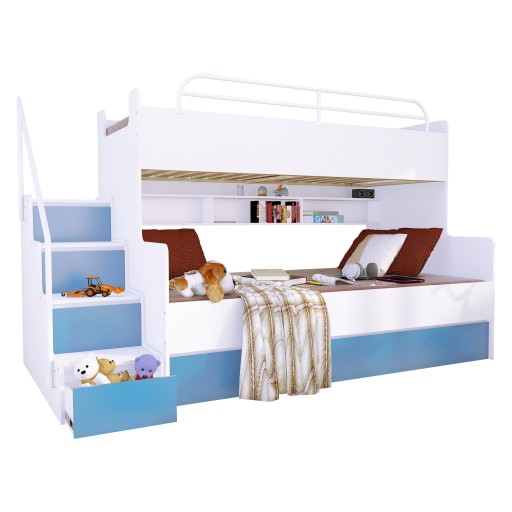 - Schodki z boku łóżka pełnią funkcję pojemników, które wysuwa się na prowadnicach rolkowych,