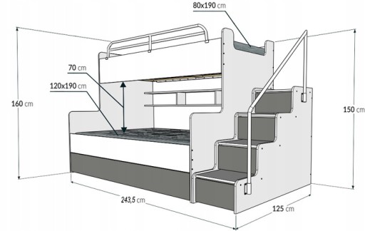 - Dolne łóżko: 120x190 cm (przeznaczone nawet dla dwóch osób)