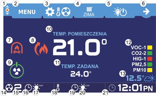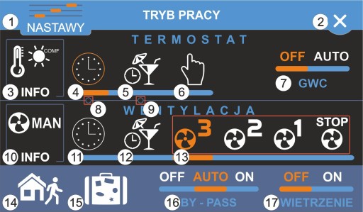 - 17: Przełącza wentylację w tryb wietrzenia. Opcja jest niewidoczna przy załączonym trybie POZA DOMEM (NANO1) lub URLOPOWY.