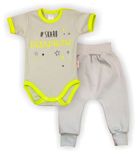 Komplet składa się z BODY z krótkim rękawem oraz LEGGINSÓW w formie spodenek stworzonych z myślą o jak największej wygodzie noszenia dla niemowląt.
