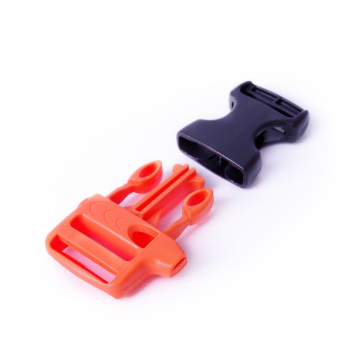Klamra zatrzaskowa z gwizdkiem ratunkowym. Świetnie się sprawdzi w charakterze zapięcia paska piersiowego w plecaku lub apteczce. Klamra jest kompatybilna z klamrą WSR20. Na taśmę 20 mm.