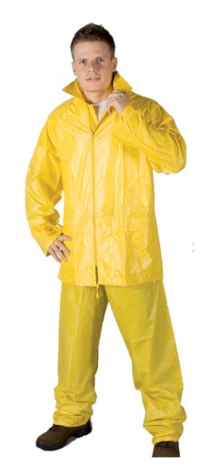 Wodoodporny, dwuczęściowy komplet przeciwdeszczowy z kapturem chowanym w kołnierzu. Klejone szwy oraz wentylacja na plecach i pod pachami. Zapinana na zamek kurtka z przodu posiada 2 szerokie kryte kieszenie. Dół kurtki oraz kaptur regulowany za pomocą sznurka; rękawy regulowane za pomocą zatrzasków. Spodnie z elastyczną gumą w pasie. Każda sztuka dostarczana w praktycznym, ułatwiającym transport opakowaniu.