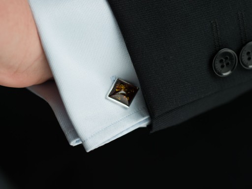 Eleganckie spinki męskie do mankietów. Wykonane z polerowanego srebra próby 925 zdobione polerowanym bursztynem bałtyckim.