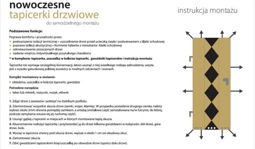 - w zestawie: tapicerka, uszczelka w kolorze tapicerki, gwoździki tapicerskie, instrukcja montażu