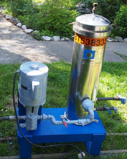 Agregat do filtracji oleju,chłodziw.Wyposażony w bardzo dokładny wysokiej jakości filtr workowy marki Shelco Filters MicroGuardian typ SHPS-718-5,pompę hydrauliczną marki Vicking Pump,silnik Century Electric 1/3 HP 115 lub 230 volt 60 Hz.Podłączony obecnie na 230 v.Wysokość 1050mm.Szerokość 320mm.Długość 610mm.Nie licząc kraników.