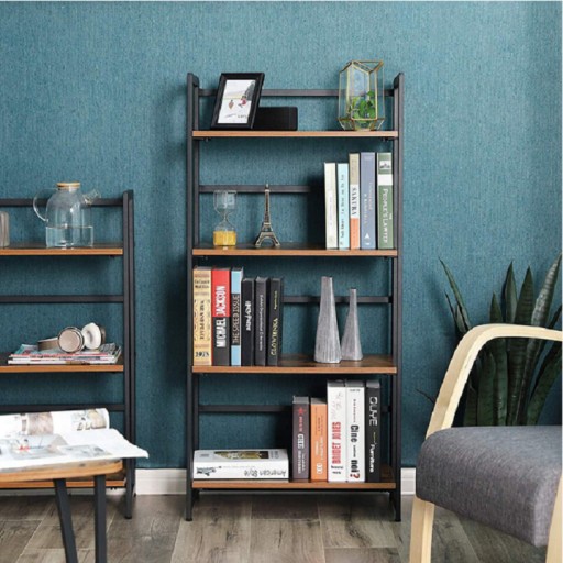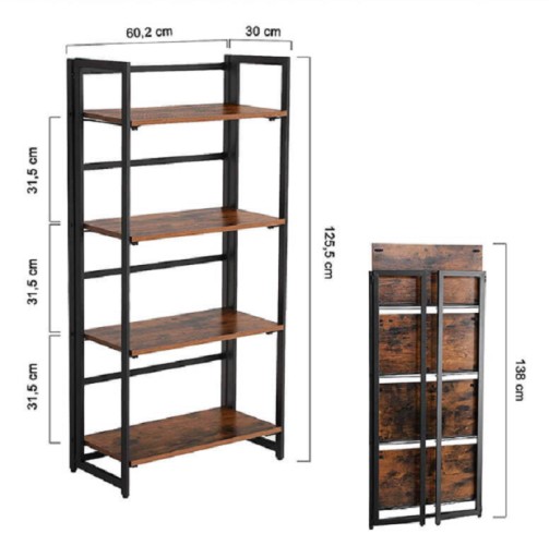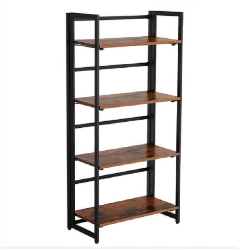 Nowoczesny regał na książki, lub inne drobiazgi wykonany w stylu vintage. Czarna metalowa rama zapewnia stabilną konstrukcje. Półki w przecieranym kolorze drewna nadają stylu i nietypowego designu