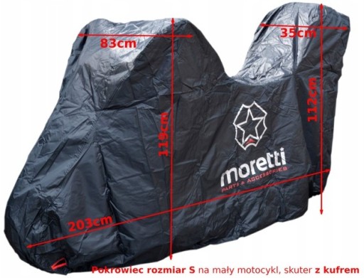 Pokrowiec motocyklowy MORETTI rozmiar S do motorowerów, motocykli i skuterów z zamontowanym kufrem centralnym.