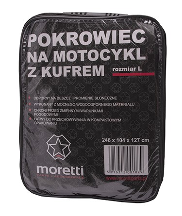 Wysokiej jakości pokrowiec motocyklowy firmy MORETTI wykonany z bardzo trwałego i odpornego na wszelkie czynniki atmosferyczne materiału. W komplecie etui na pokrowiec. Wykonany w taki sposób że bez problemu możemy zasłonić cały motocykl z lusterkami i kufrem centralnym.