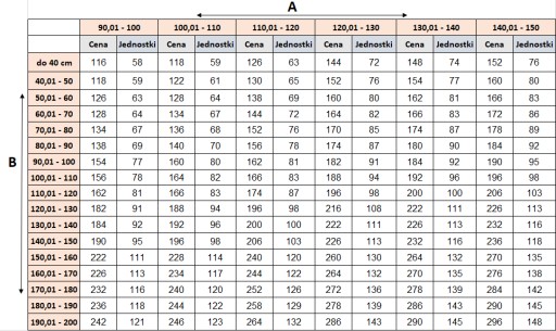 Przykład dla moskitiery o wymiarach: 47cm x 100cm – 63 sztuk, zgodnie z poniższą tabelą