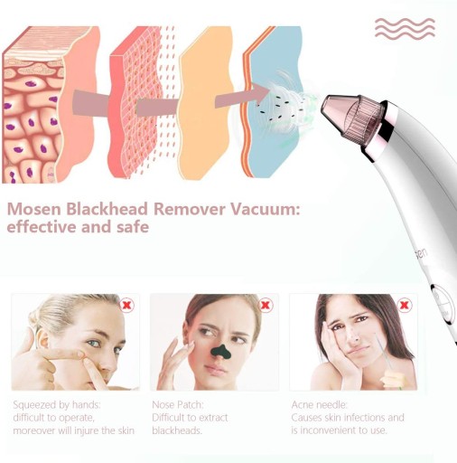 【BEZPIECZNE I SKUTECZNE】 Wybrane narzędzie do czyszczenia zaskórników, wykonane z materiałów ABS, wykorzystuje skuteczne fizyczne podejście do rozwiązywania problemów skórnych bez żadnych toksycznych i szkodliwych chemikaliów. 5 wymiennych sond zaprojektowanych jest dla różnych typów skóry i różnych obszarów skóry. Trzy tryby podciśnienia są odpowiednie dla wszystkich popularnych typów skóry, tłustej / neutralnej / suchej. Mosen, pomóż ci wrócić do najlepszego stanu skóry jak noworodek, wejdź w nowe życie.
