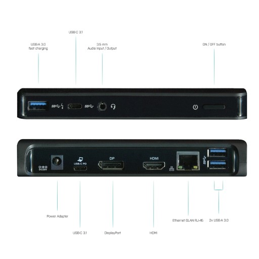 Stacja dokująca oferuje 3x port USB 3.0 do podłączenia urządzeń USB 3.1/3.0/2.0 oraz szybką transmisję danych do 5 Gbps (w tym 1x port USB 3.0 do ładowania wg specyfikacji BC 1.2), 1x USB-C port dla podłączenia nowoczesnych urządzeń wyposażonych w port USB-C (żadna USB-C stacja dokująca nie może wyświetlać obrazu wideo za pośrednictwem portu USB-C, to potrafi tylko stacja dokująca Thunderbolt 3) a 1x audio jack dla podłączenia słuchawek oraz mikrofonu. Stacja dokująca jest kompatybilna z MacBook Pro 2016, MacBook 2015, Chromebook Pixel 2015, Acer Switch Alpha 12, Dell XPS 13, HP EliteBook Folio G1, ASUS UX390UAK oraz innymi urządzeniami wyposażonymi w nowy port USB-C. Nowe złącze USB-C posiada wiele zalet. Jest mniejsze i symetryczne, pozwala na wpięcie dowolną stroną.
