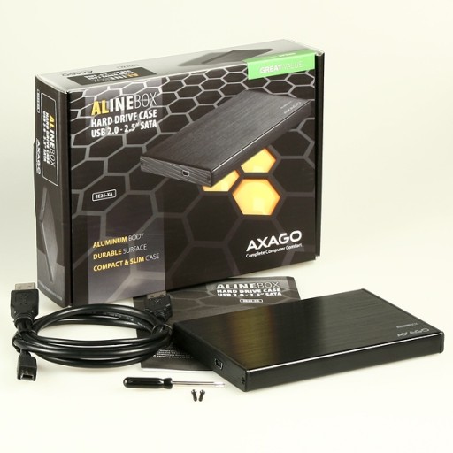 Axago EE25-XA ALINE box to kompaktowa zewnętrzna obudowa aluminiowa z interfejsem USB 2.0 przeznaczony dla dysków 2,5" SATA. Wytrzymała obudowa z odlewu aluminiowego zapewnia doskonałą mechaniczną ochronę napędu i bardzo dobre rozpraszanie ciepła.